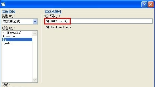 注意:上述域名称“EQ”与后面的域代码“\F(4,4)”之间需要有一个空格。