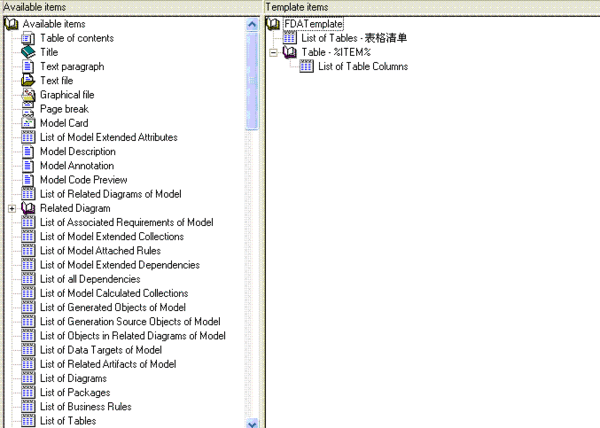 这时候,我们左右2个区,Aavailable区域中选择你想要在WORD文档中展示的东东,这里我们选择List of Tables,和List of Table Columns[数据表格信息]