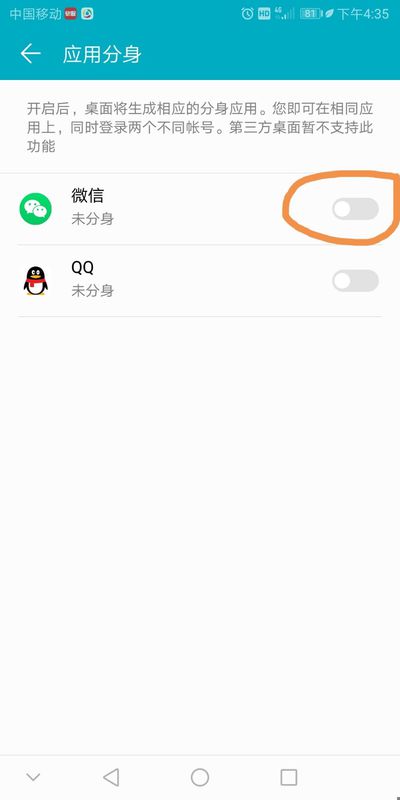 3、点击应用分身,在打开的列表中有两个应用,分别是微信和QQ,这时点击微信右边的按钮开启应用分身功能: