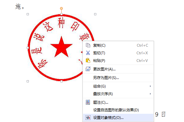 4、加入了公章之后,单击此公章,然后右键单击鼠标,选择设置对象格式选项进入。