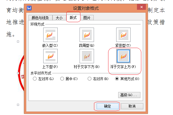 5、进入到设置对象格式页面之后,在版式里面选择浮于文字上方,点击确定即可。