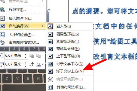 3、然后我们在弹出来的窗口中右键单击图片选择自动换行中的“浮于文字上方”,之后拖动到想要的位置即可。