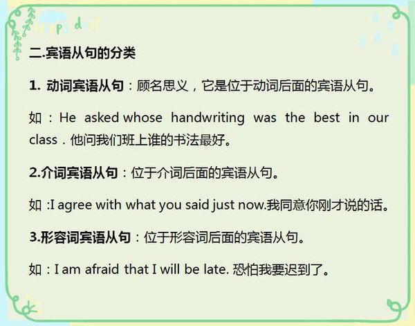 1、动词后的宾语从句只要有三种情况,一是动词后面直接带宾语从句;二是有些“动词+副词”结构后可以带宾语从句;三是动词短语后可带宾语从句。
