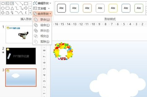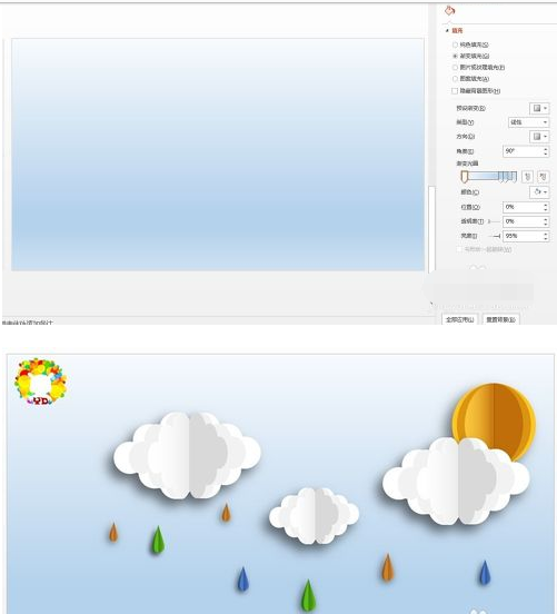 1、新建一个PPT页面,设置好场景的颜色。构造一下具体的场景,举例,需要几朵云彩、一个太阳、一些雨滴。都需要靠插入形状、修改形状来获得。