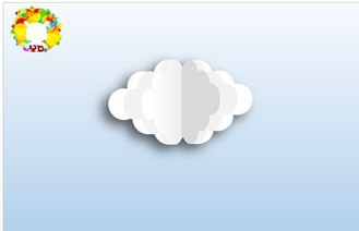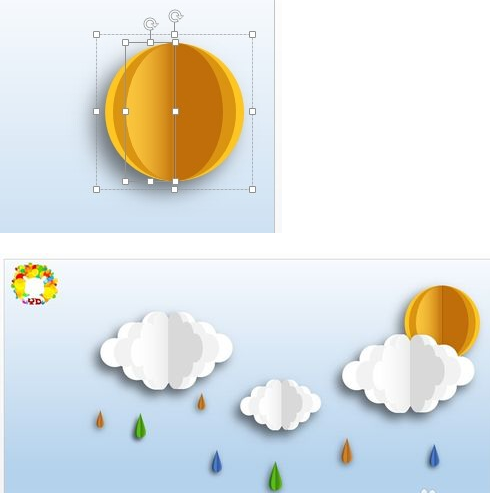 5、按照做云彩的方法,依次做出立体效果的太阳和雨滴。然后进行版面构图,将各种形状调整位置、大小即可。