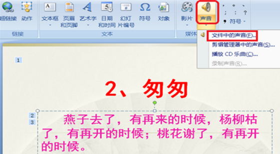 8、有时还需要在课件中插入相关的声音和视频进行补充说明,在菜单栏中找到“插入”,单击一下,在工具栏中找到声音,就是一个小喇叭的标志,单击一下,可以选择文件中的声音,当然,自己需要的声音和视频都需要提前下载到电脑中,保存在一个位置。