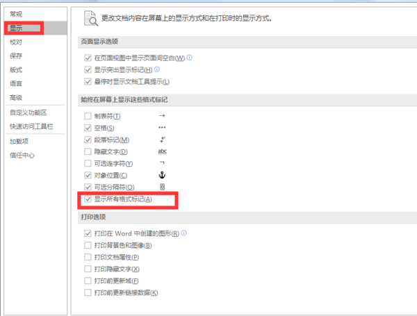 1.首先确定是是不是空白行,可以打开word选项,在显示中勾选“显示所有格式标记”。