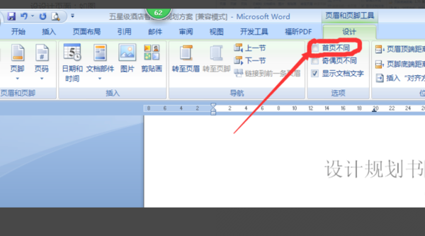 双击打开需要设置的页眉,会自动展示出“设计”工具栏。勾选上“首页不同”。