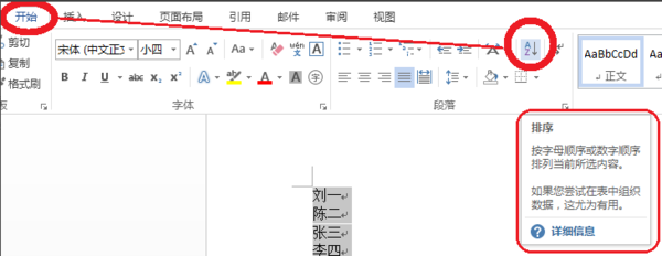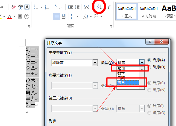 思路:第一步、将名字间的空格替换为段落标记,使每个名字占一行;第二步、表格 → 排序,然后设置按拼音排序即可。