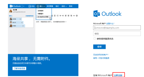 3.出现的outlook 邮箱登陆窗口,如果你没有outlook邮箱点击“立即注册”即可。