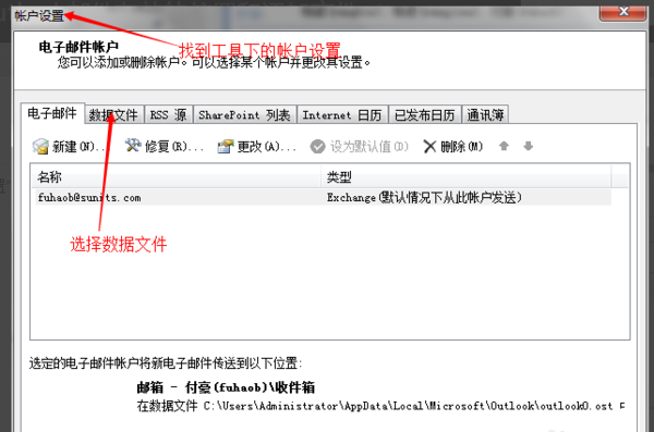 3,打开“帐户设置”,然后点击数据文件,如下图所示: