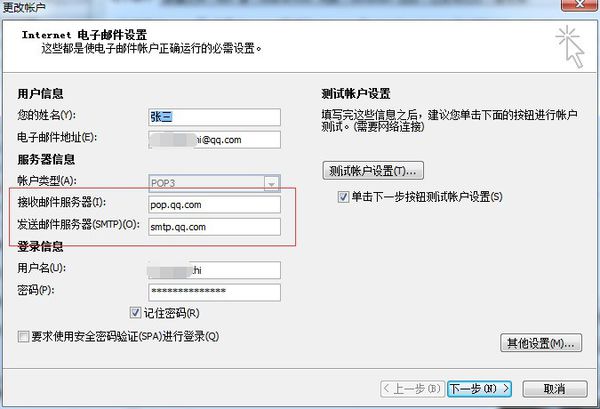 3、双击要查看的邮箱,弹出向导中即可查看该邮箱接收服务器及发送服务器地址。