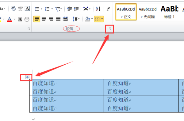 一、打开含有表格的word文档,点击表格左上方快速选中全部表格,然后在“开始”标签栏,找到“段落”编辑,点击右下方按钮进入段落设置。
