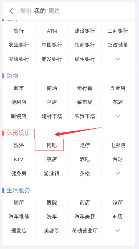4、最后在休闲娱乐项目下找到网吧,并点击。