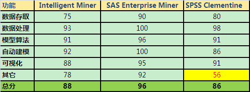SASEnterpriseMiner:SAS完全以统计理论为基础,功能强大,有完备的数据探索功能。但难以掌握,要求高级统计分析专业人员,结果难以理解。价格极其昂贵。