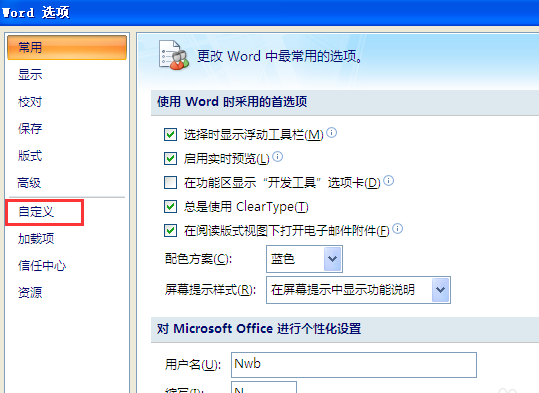 3、在弹出的【Word选项】窗口中,左边一栏找到【自定义】选项并点击