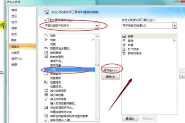 4、然后会出现一个word选项,选择自定义,点击不在功能区中的命令,然后找到计算。