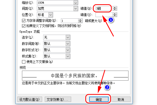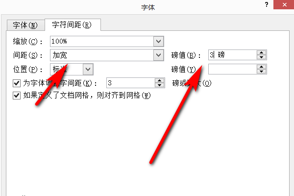 3、进入到字体设置页面之后,切换到字符间距页面,在间距一栏中选择加宽,并在后面的磅值中设置需要的数值。
