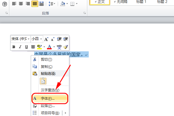 2、然后右键点击选中的文字,在弹出的选项中点击“字体”。