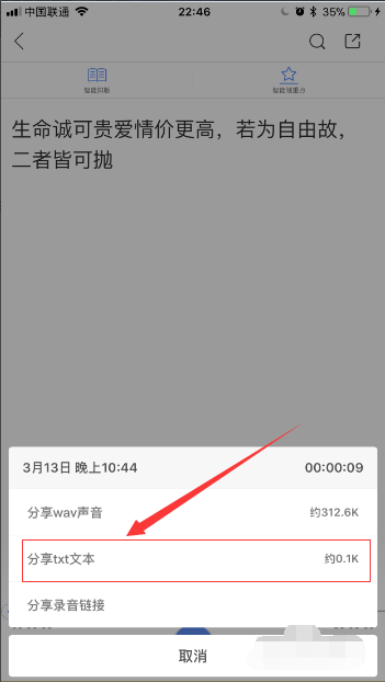 5、点击分享图标可将录音生成为wav声音、txt文本、录音连接保存与分享。