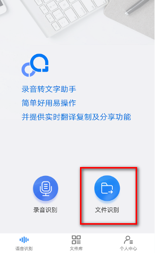 然后运行打开录音转文字助手,然后选择“语音识别”这个页面,页面上有两个按钮,选择“文件识别”这个按钮,点击进去。