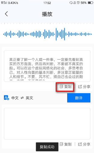 3、最后等录音转换成文字后,点击复制。