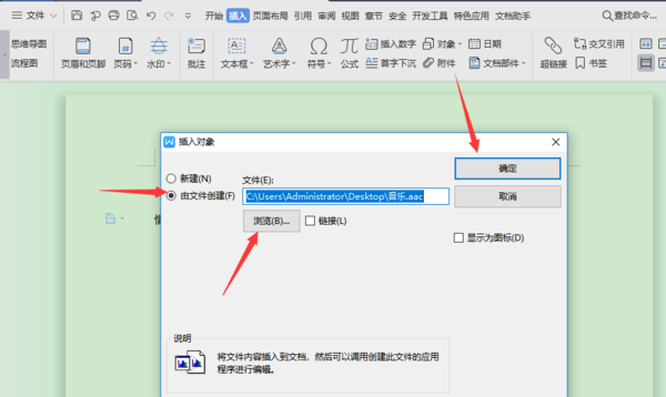 4、接下来在插入对象页面中,选择“由文件创建”,然后选择自己需要的音乐文件即可,最后点击“确定”。