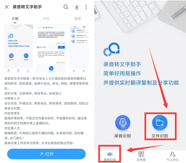 1、在手机安装并打开录音转文字助手,打开之后,点击文件识别。