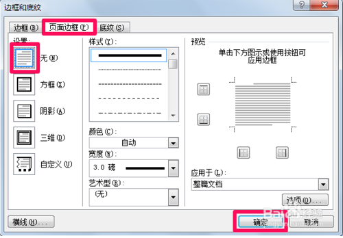 2、在边框和底纹中选择页面边框,然后点击无,最后点击确定。