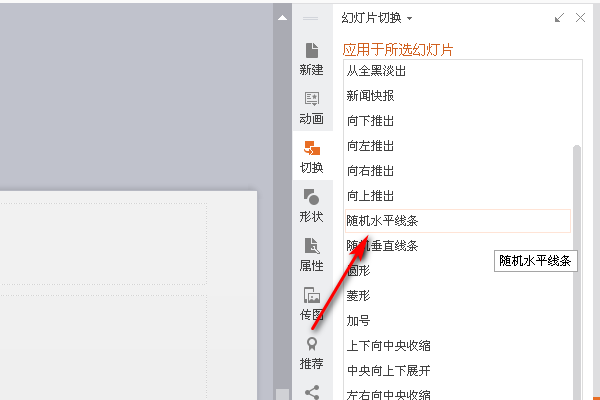 4.接着在右手边弹出的窗口中,在应用于所选幻灯片下面找到随机水平线条,点击即可。