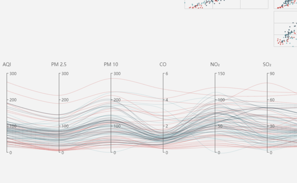 ECharts 3 开始加强了对多维数据的支持。除了加入了平行坐标等常见的多维数据可视化工具外,对于传统的散点图等,传入的数据也可以是多个维度的。配合视觉映射组件visualMap提供的丰富的视觉编码,能够将不同维度的数据映射到颜色,大小,透明度,明暗度等不同的视觉通道。