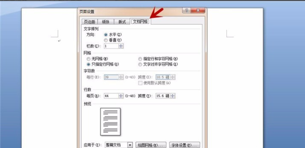 6、点击页面设置的“文档网格”,可以对文字排列主要是文字的方向是水平还是垂直,以及设置网格的字符数和行数。