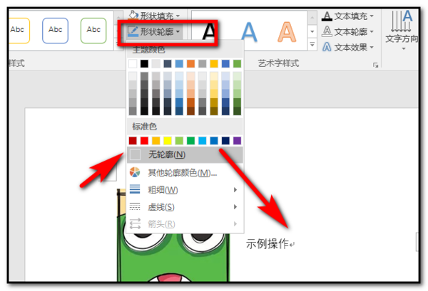 4、接着点击文本框,在上方格式菜单里找到”形状轮廓“选项,单击后选择”无轮廓“即可。此时文字即到达需要的位置,且不会在文字周围多处一个边框。