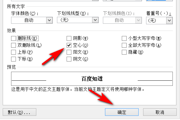 四、然后,在“字体”设置窗口中找到“空心”选项,然后勾选“空心”选项。