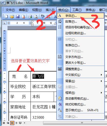 1.选中需设置动态效果的文字,点击菜单栏中的【格式】,在格式的下拉栏中点击【字体】。