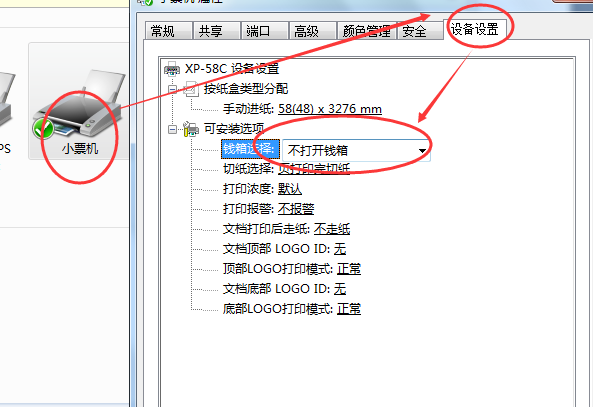 首先把钱箱连接在打印机后面的钱箱接口,可以按照下图去设置