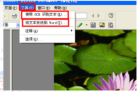 2.打开软件后,选择“文件”-打开刚刚另存为TIFF类型的文件。然后点击“工具”-“使用OCR识别文本...”进行识别后,在点击“将文本发送到word...”。