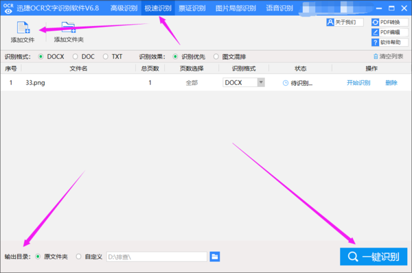 首先呢,先在电脑上运行ocr文字识别工具,选择上面的‘极速识别’功能;