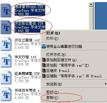 2、将想要安装的字体文件复制,这里随便复制两种(博洋草书和方正彩云繁体)。