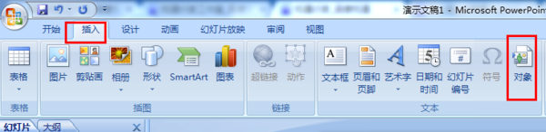 第一步:新建PPT文档(或者打开已有PPT文档),如图,切换到插入选项卡,单击对象按钮,打开插入对象对话框。