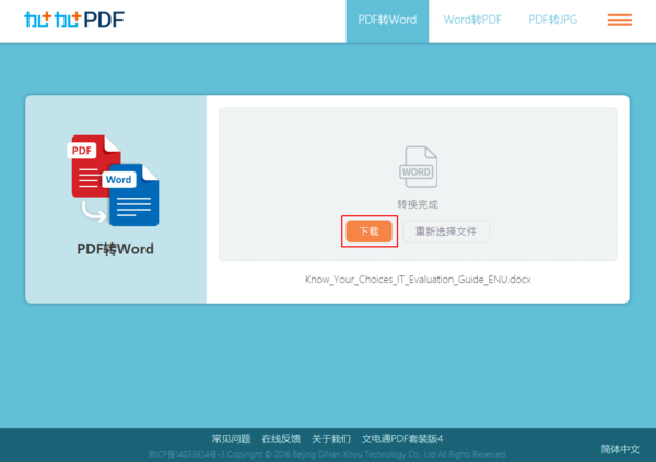 4、等待数秒后就转换完成了,点击下图中的“下载”按钮就可以下载转换好的Word文档了。