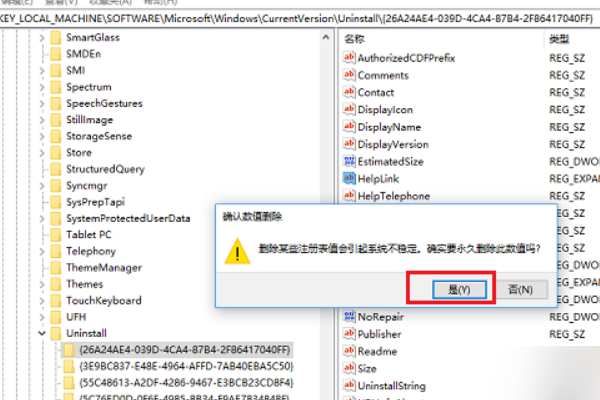 6、会弹出提示框,点击”是“删除注册表信息成功。
