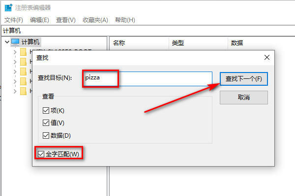 4.粘贴复制的程序文件名,单击查找,勾选全字匹配。