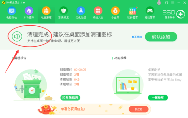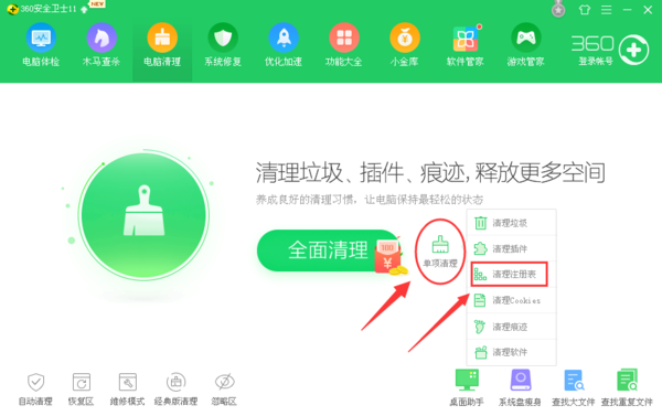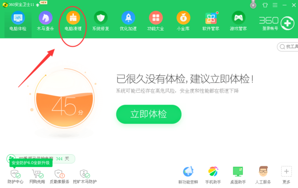 第一步:打开360安全卫士,点击“电脑清理”功能;