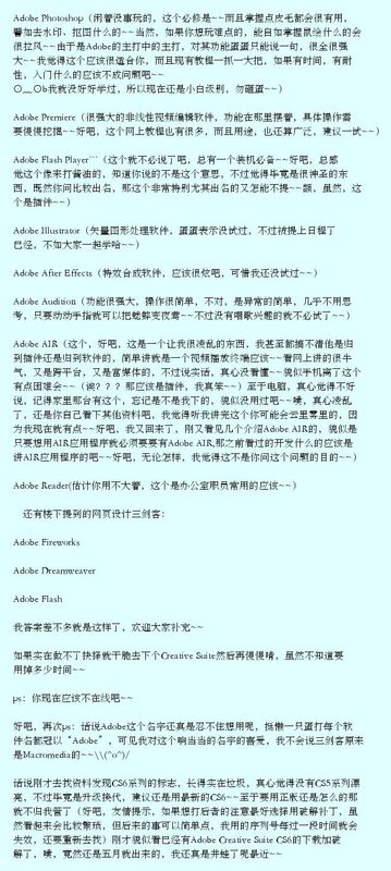 (1)Adobe Creative Suite软件类: 译Adobe创意套件,是Adobe系统公司出品的一个图形设计、影像编辑与网络开发的软件产品套装。该套装包括电子文档制作软件Adobe Acrobat、矢量动画处理软件Adobe Flash、网页制作软件Adobe Dreamweaver、矢量图形绘图软件Adobe Illustrator、图像处理软件Adobe Photoshop和排版软件Adobe InDesign等产品。