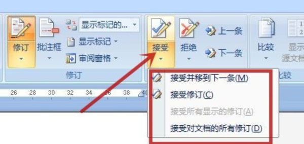 4、您还可以单击“accept”(如图中红色箭头所示),并在弹出菜单中选择所需的选项(如图中红色框所示)。这里我们以单击“接受对文档的所有修订”为例。