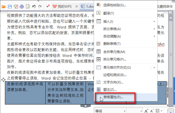 2.单击右键,在弹出的菜单中选择“表格属性”