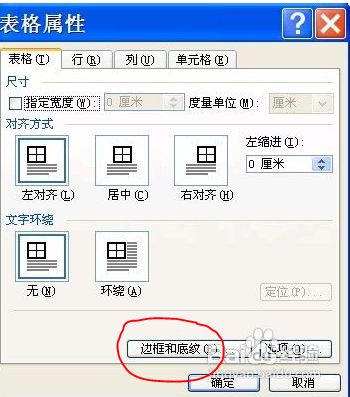 3.在弹出的对话框中,选择“表格”选项卡,在下边有一个 “边框和底纹”按钮