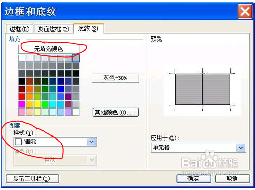 3、切换到“底纹”选项卡,点击“填充”旁边的小三角形,选择“没有颜色”或“无”。