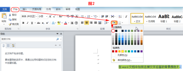 选中要取消颜色的文字,找到word顶部“开始”菜单下的“底纹”,在弹出的“主题颜色”中,选择“白色”即可。如图2所示。